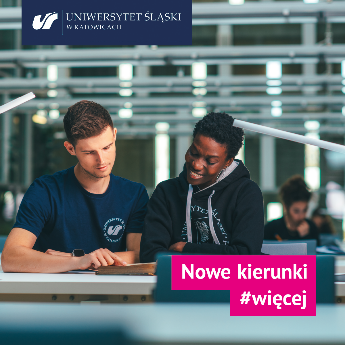 Nowe kierunki na Uniwersytecie Śląskim - dwójka studentów siedzących przy stole w bibliotece