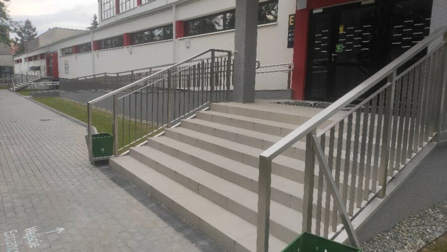 Różnicę poziomów pomiędzy chodnikiem, a wejściem do budynku można pokonać schodami, które wyposażono w poręcze po obu stronach. Schody te można ominąć podjazdem, który również otoczono wielopoziomowymi poręczami.