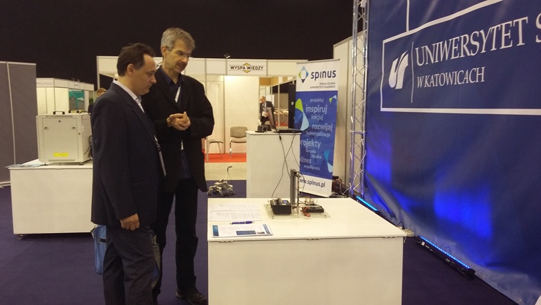 Dwóch mężczyzn przy stoisku Uniwersytetu Śląskiego w Katowicach
