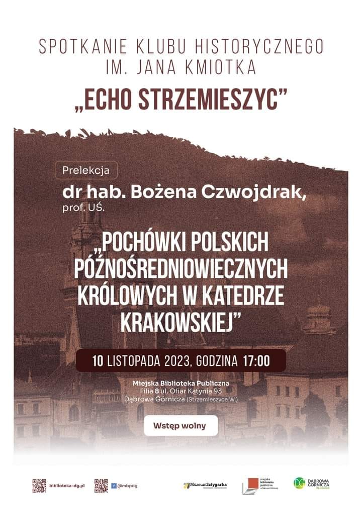Miejska Biblioteka Publiczna w Dąbrowie Górniczej oraz Muzeum Miejskie Sztygarka serdecznie zapraszają wszystkich miłośników historii na wykład „Pochówki polskich późnośredniowiecznych królowych w katedrze krakowskiej”, który wygłosi dr hab., prof. UŚ Bożena Czwojdrak z naszego Instytutu. Prelekcja odbędzie się 10 listopada o godz. 17:00 w filii nr 8 MBP w Dąbrowie Górniczej (ul. Ofiar Katynia 93). Szczegóły poniżej: