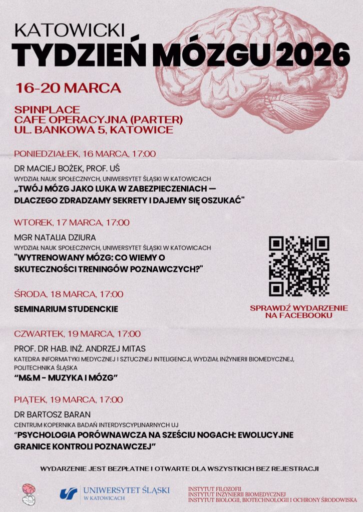 Od 16 do 20 marca 2026 roku na Uniwersytecie Śląskim w Katowicach odbywać będzie się Tydzień Mózgu 2026 w Katowicach, w ramach światowego Brain Awareness Week. W ramach obchodów tego naukowego święta, codziennie odbędzie się popularnonaukowy wykład prowadzony przez eksperta, a w środę – dzień studencki, podczas którego osoby studiujące będą prezentowały swoje wystąpienia.