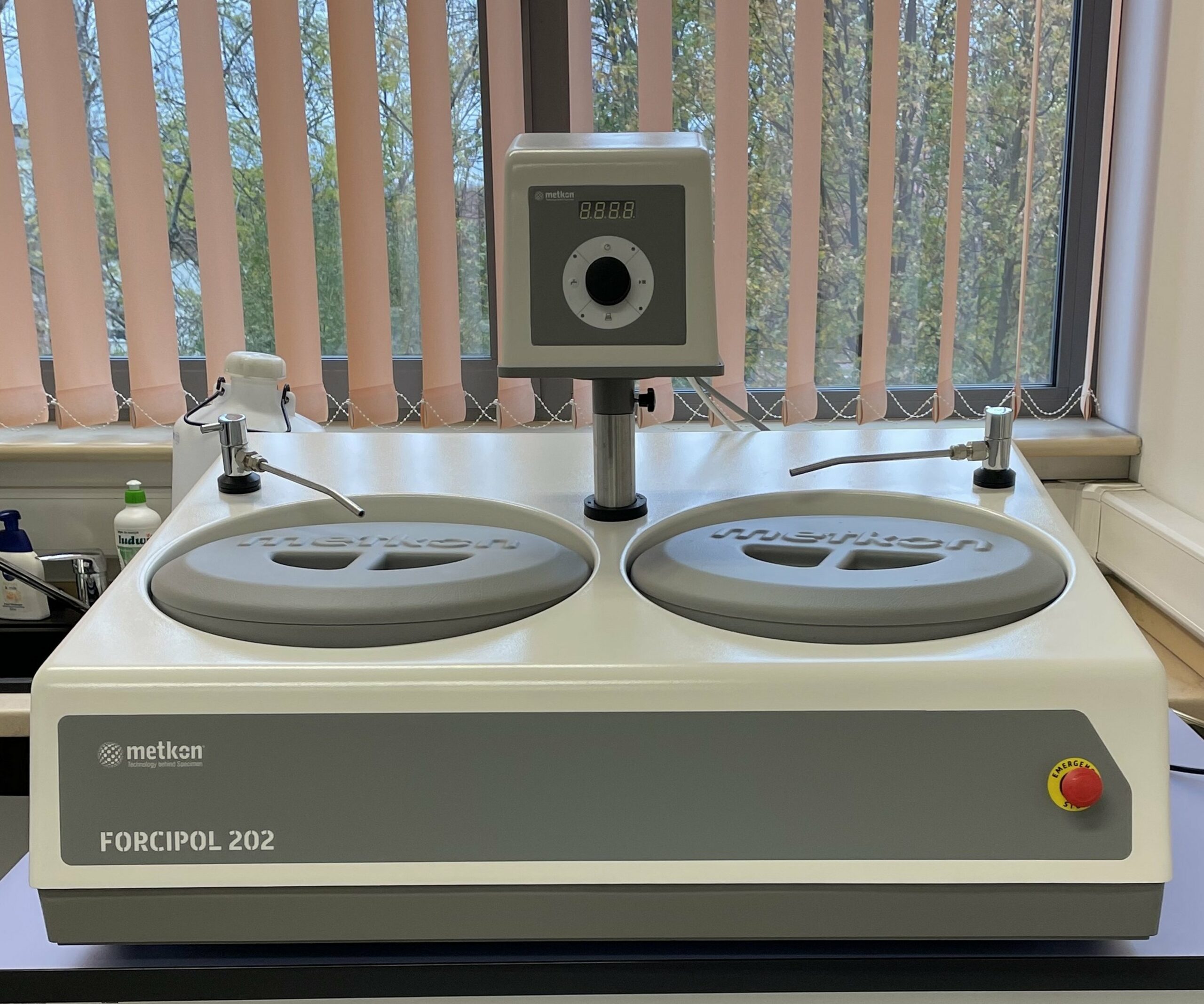 - Metkon FORCIPOL 202 POLISHING AND GRINDING MACHINE WITH CONTROL HEAD. This dual-disc laboratory grinding and polishing machine is used in the preparation of metal, ceramic, and composite samples. It is used for mechanical grinding and polishing of samples to obtain a smooth, scratch-free surface, essential for further electrochemical and microscopic examinations. The device has two working plates that can rotate at adjustable speeds, allowing for simultaneous processing of two samples or the use of different grits of abrasive materials