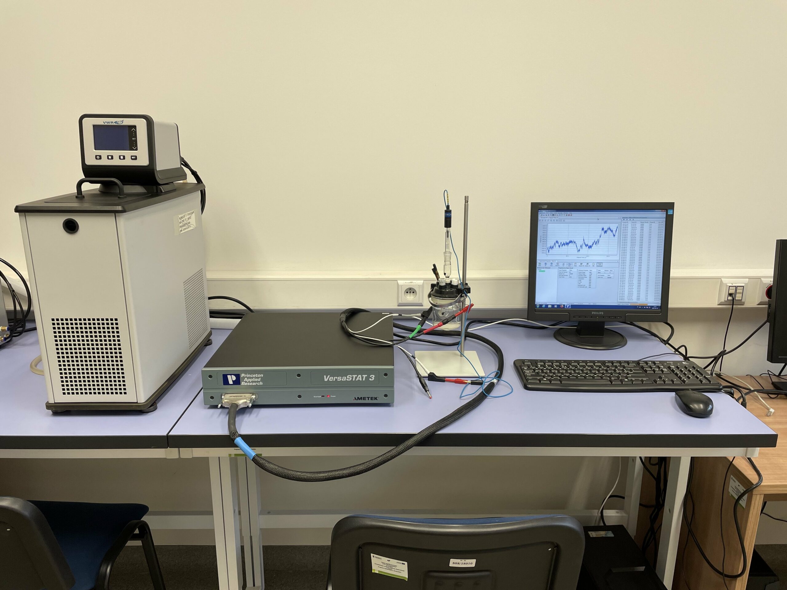 - VersaSTAT 3 potentiostat (AMETEK). An advanced research device for precise control of potential and current in electrochemical systems, also equipped with a frequency analyzer for impedance measurements. With a wide measurement range (±10 V, ±650 mA with expandability) and electrochemical impedance (EIS) measurement option from 10 µHz to 1 MHz, the system enables comprehensive analysis of electrochemical processes. The potentiostat is used in corrosion studies, analysis of batteries, supercapacitors, fuel cells, biomaterials, sensors, and electrode and coating deposition processes. High sensitivity, measurement stability, and VersaStudio software make it a versatile electrochemical tool.
