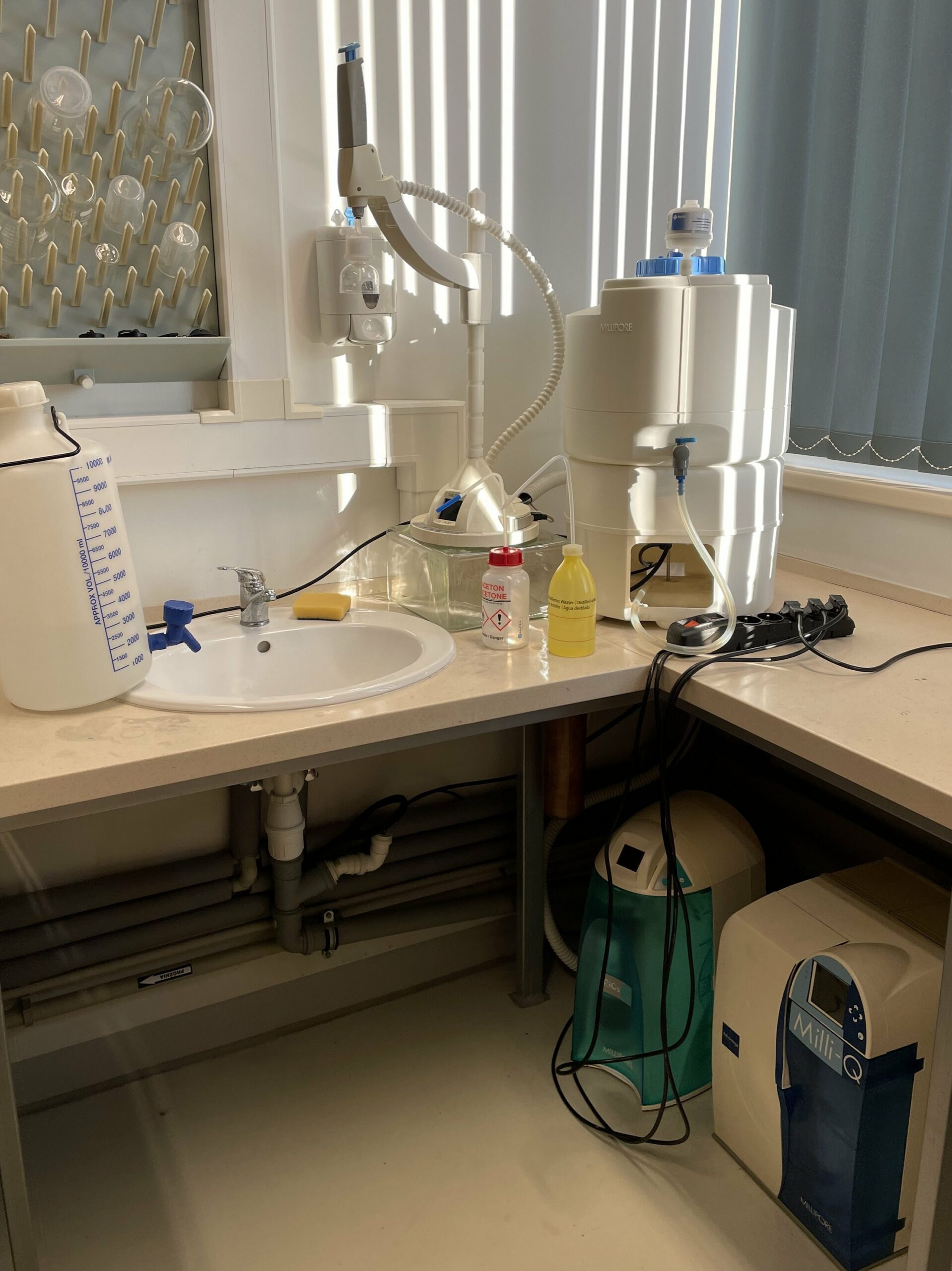 - MILLI-Q ADVANTAGE water purification system from Millipore (now Merck). An advanced laboratory water purification system designed to produce the highest purity water, Type I (ultrapure) water that meets ASTM, ISO, and CLSI standards. Using a multi-stage purification process (filtration, reverse osmosis, deionization, UV, and final filtration), the system removes ions, organic compounds, bacteria, and particulate matter. Water obtained from the MILLI-Q Advantage is used in biological, chemical, and pharmaceutical research, as well as in techniques requiring high purity, such as HPLC, ICP-MS, PCR, spectroscopy, cell culture, and the preparation of buffers and standard solutions.