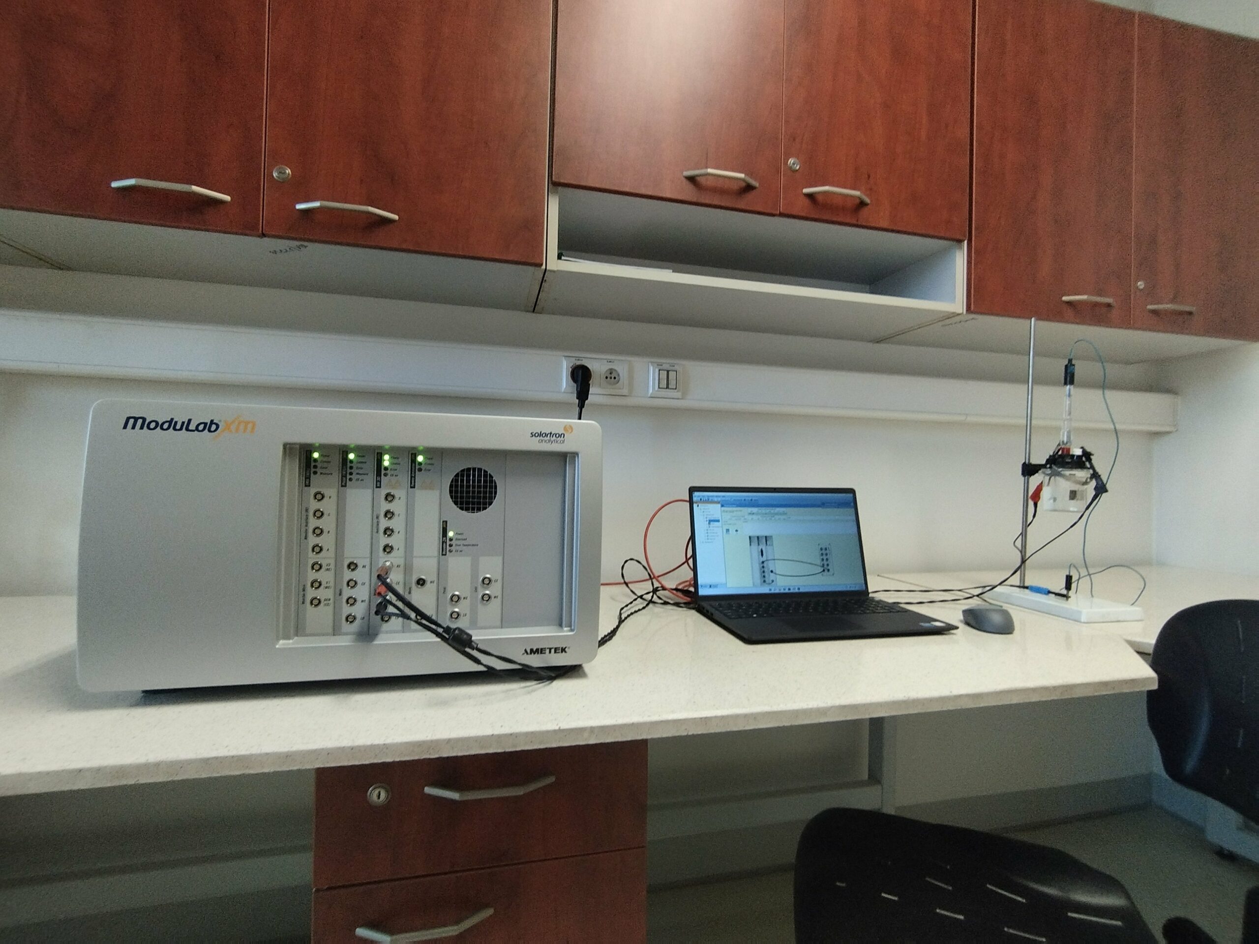 - ModuLab XM ECS ELECTROCHEMICAL MEASUREMENT SYSTEM from Solartron Analytical. This advanced, modular research kit is designed for the comprehensive analysis of electrochemical processes. It enables a wide range of measurements, such as electrochemical impedance spectroscopy, chronopotentiometry, chronoamperometry, cyclic voltammetry, and material capacitance and conductivity measurements. Thanks to its high sensitivity, wide frequency range (from microhertz to megahertz), and precise potential and current control, the system allows for the study of electrode materials and electrochemical cells, as well as corrosion systems, sensors, supercapacitors, fuel cells, and biomaterials.