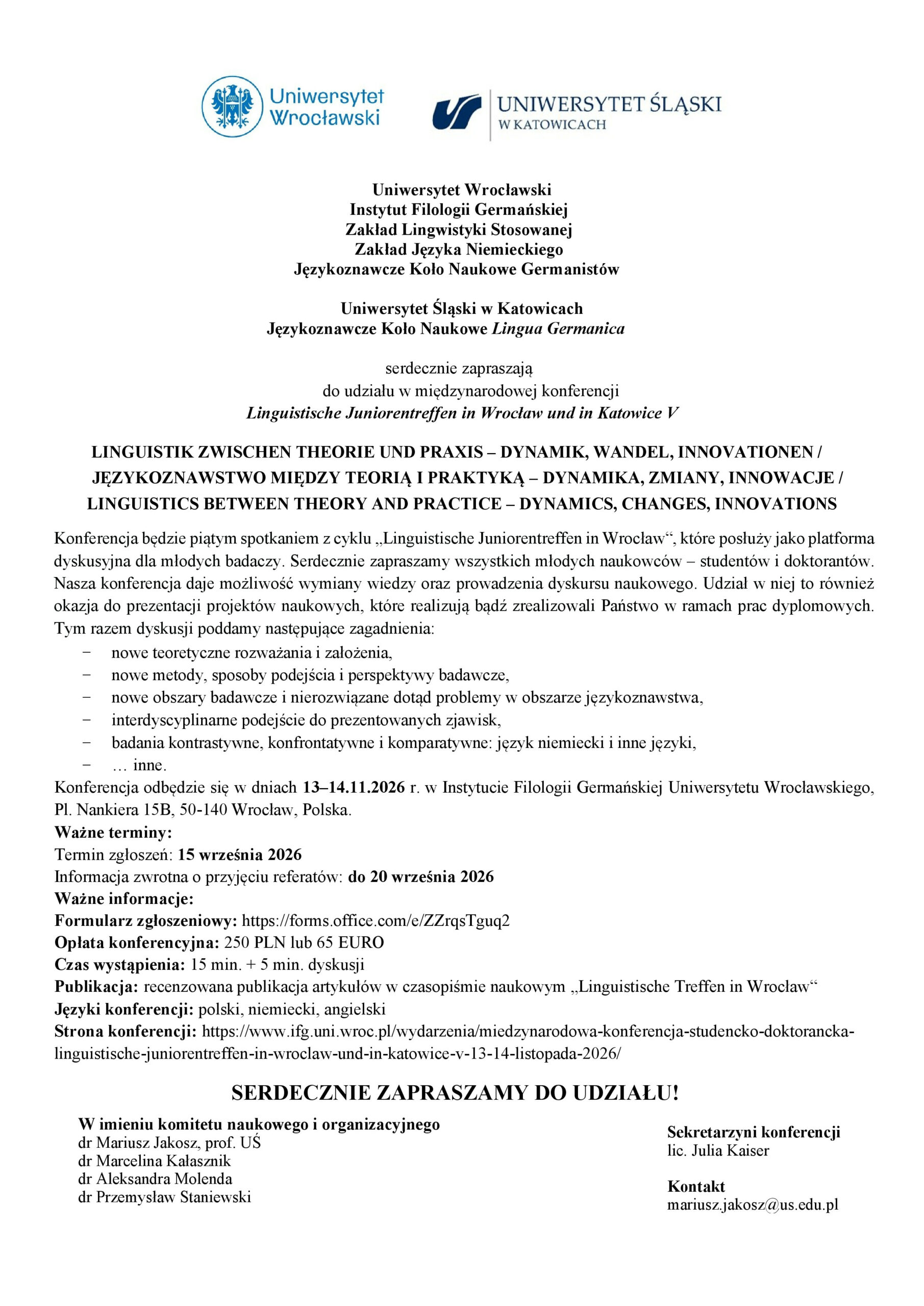 Międzynarodowa konferencja naukowa: „Linguistische Juniorentreffen in Wrocław und in Katowice V” (13-14.11.2026)