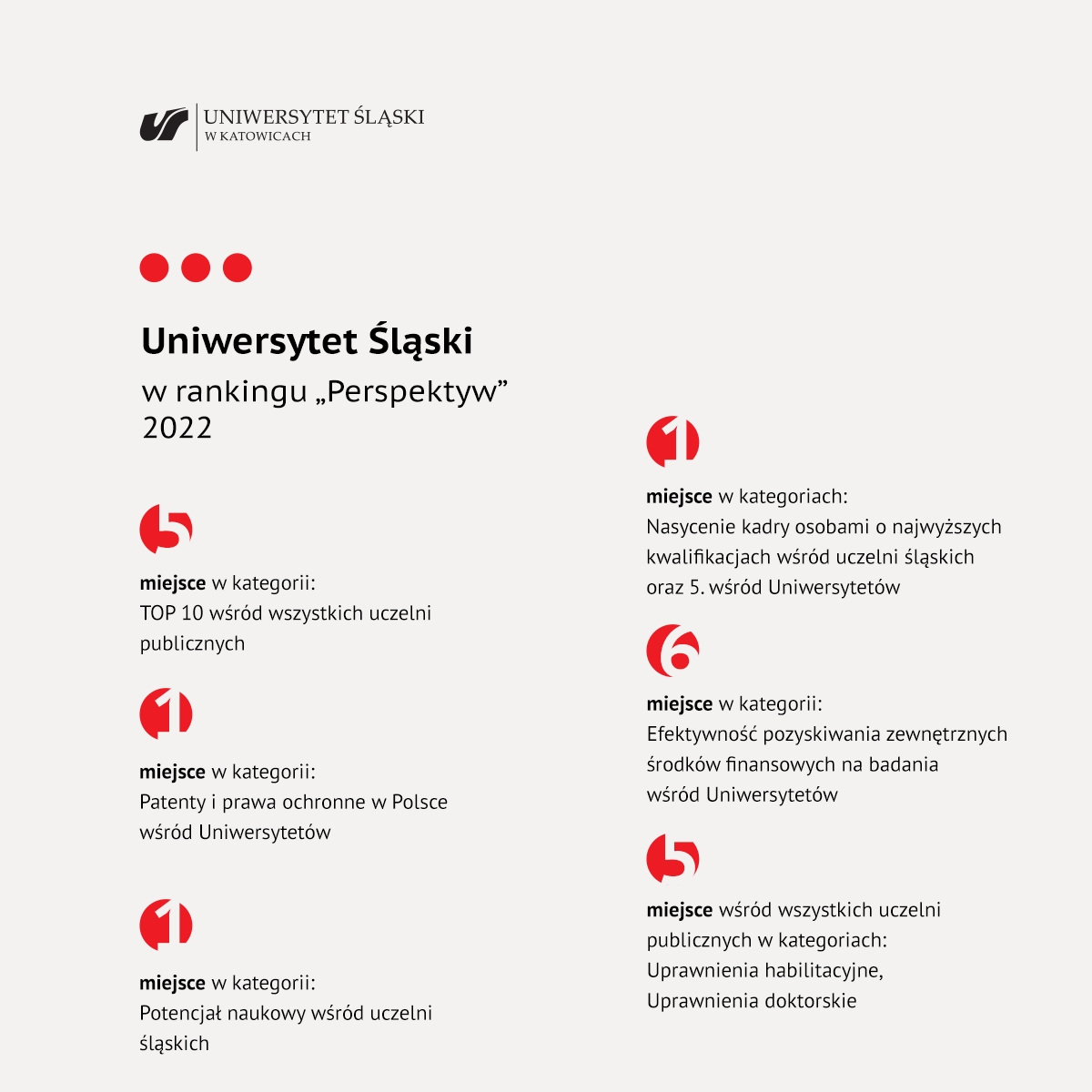 Jak co roku portal „Perspektywy” opracował ranking szkół wyższych. Uniwersytet Śląski zajął wysoką, 8. pozycję wśród uniwersytetów (awans o jedną lokatę w porównaniu do zeszłorocznego zestawienia) oraz 27. miejsce w gronie 96 wszystkich notowanych uczelni (awans o dwie pozycje w stosunku do rankingu z 2021 roku). W klasyfikacji doceniono jakość i innowacyjność nauki prowadzonej na UŚ oraz atrakcyjność oferty edukacyjnej.