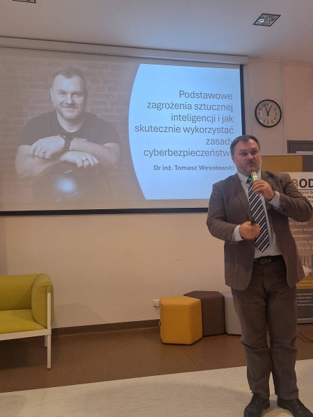 Dr inż. Tomasz Wesołowski wygłosił wykład pt.: „Podstawowe zagrożenia sztucznej inteligencji i jak skutecznie wykorzystać zasady cyberbezpieczeństwa”, który nawiązywał do bardzo aktualnej problematyki związanej z korzystaniem z narzędzi sztucznej inteligencji.