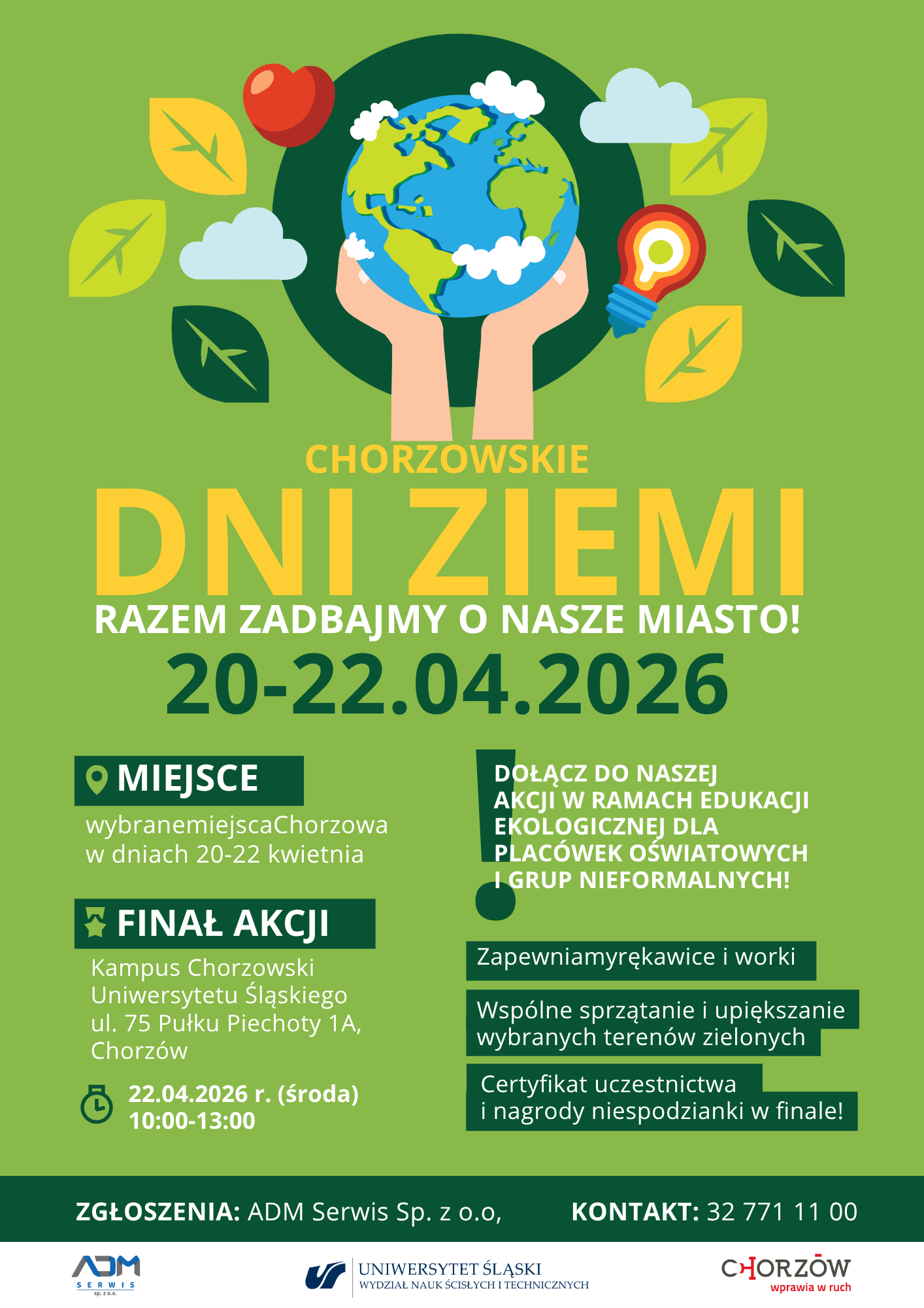 Uniwersytet Śląski w Katowicach oraz miasto Chorzów zapraszają obchody Dnia Ziemi 2026 r. Tegoroczne obchody podzielono na dwa etapy. Pierwszy z nich to Miejski Dzień Ziemi, który odbędzie się w sobotę, 18 kwietnia. Od godziny 10:00 do 13:00 w Dolinie Górnika na całe rodziny czekać będzie niezbędny sprzęt – rękawice i worki – oraz wspólna zabawa na świeżym powietrzu. To propozycja dla tych, którzy chcą aktywnie zadbać o swoją najbliższą okolicę w swobodnej atmosferze.