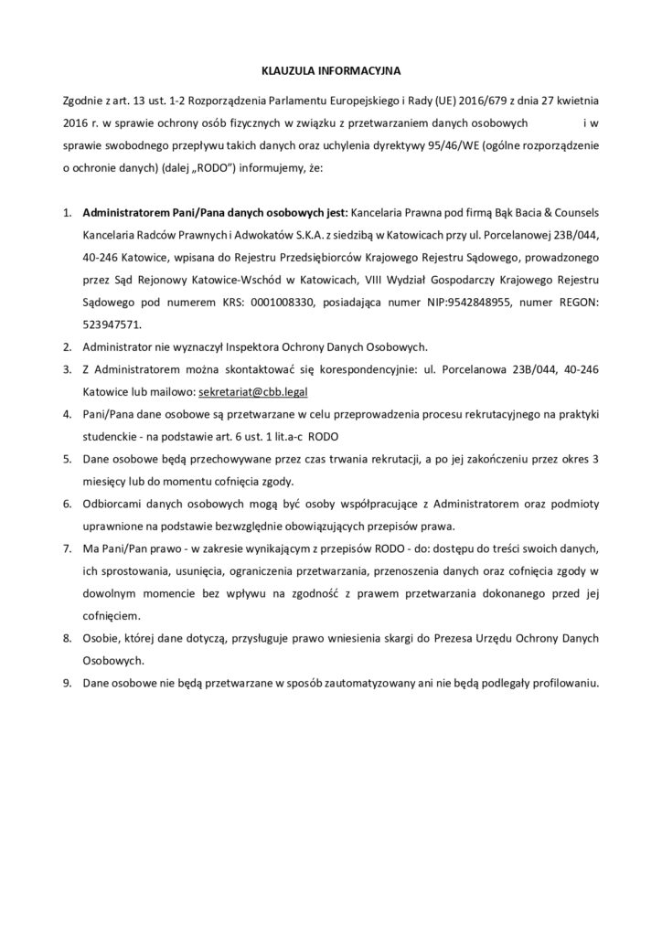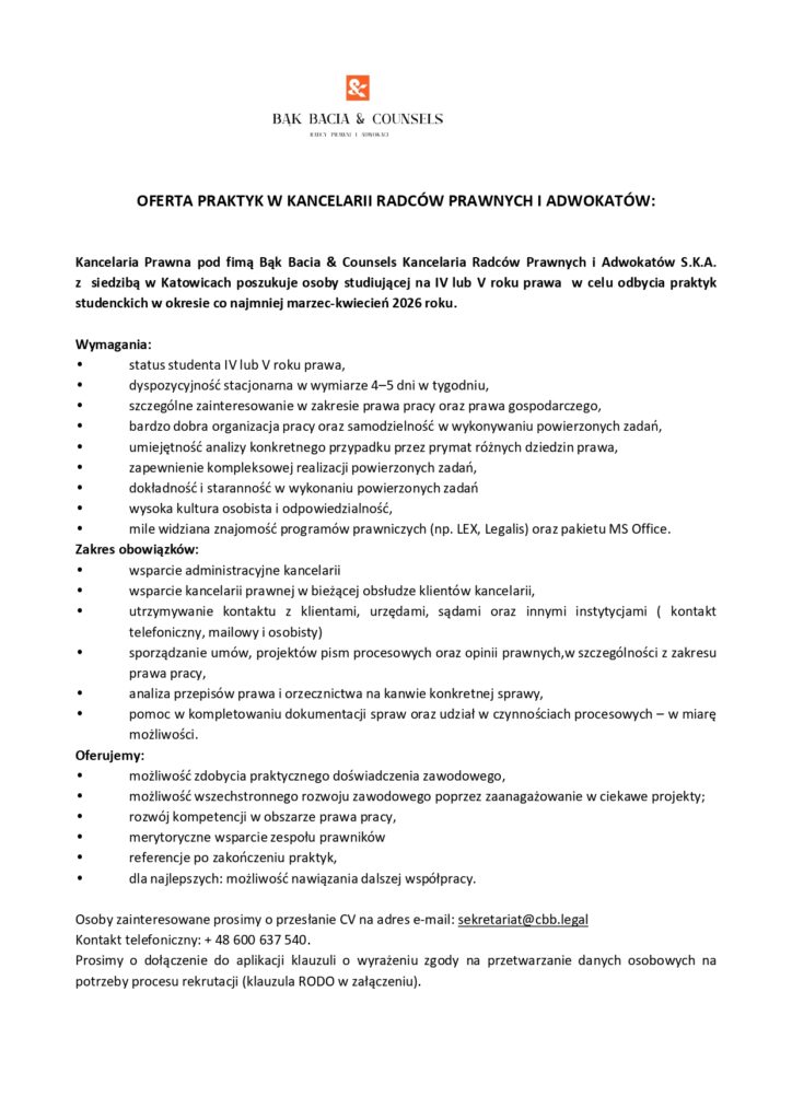 Kancelaria Prawna pod fimą Bąk Bacia & Counsels Kancelaria Radców Prawnych i Adwokatów S.K.A. w Katowicach