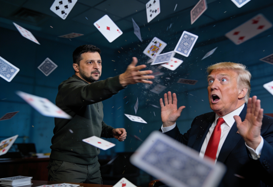 Podczas burzliwego spotkania Donalda Trumpa z Wołodymyrem Zełenskim w lutym 2025 roku, kiedy amerykański prezydent próbował dać ukraińskiemu partnerowi do zrozumienia, że jest on w słabej pozycji do negocjacji, użył w rozmowie angielskiego idiomu: nie masz kart. Zełenski wówczas wstał i wyjął z rękawa talię kart, którą zasypał zdziwionego i kulącego się od tej karcianej powodzi Trumpa. Jest też inna wersja, w której Ukrainiec wyprowadza zgrabny prawy sierpowy w niczego niespodziewającego się prezydenta i go nokautuje. Naprawdę tego nie widzieliście?