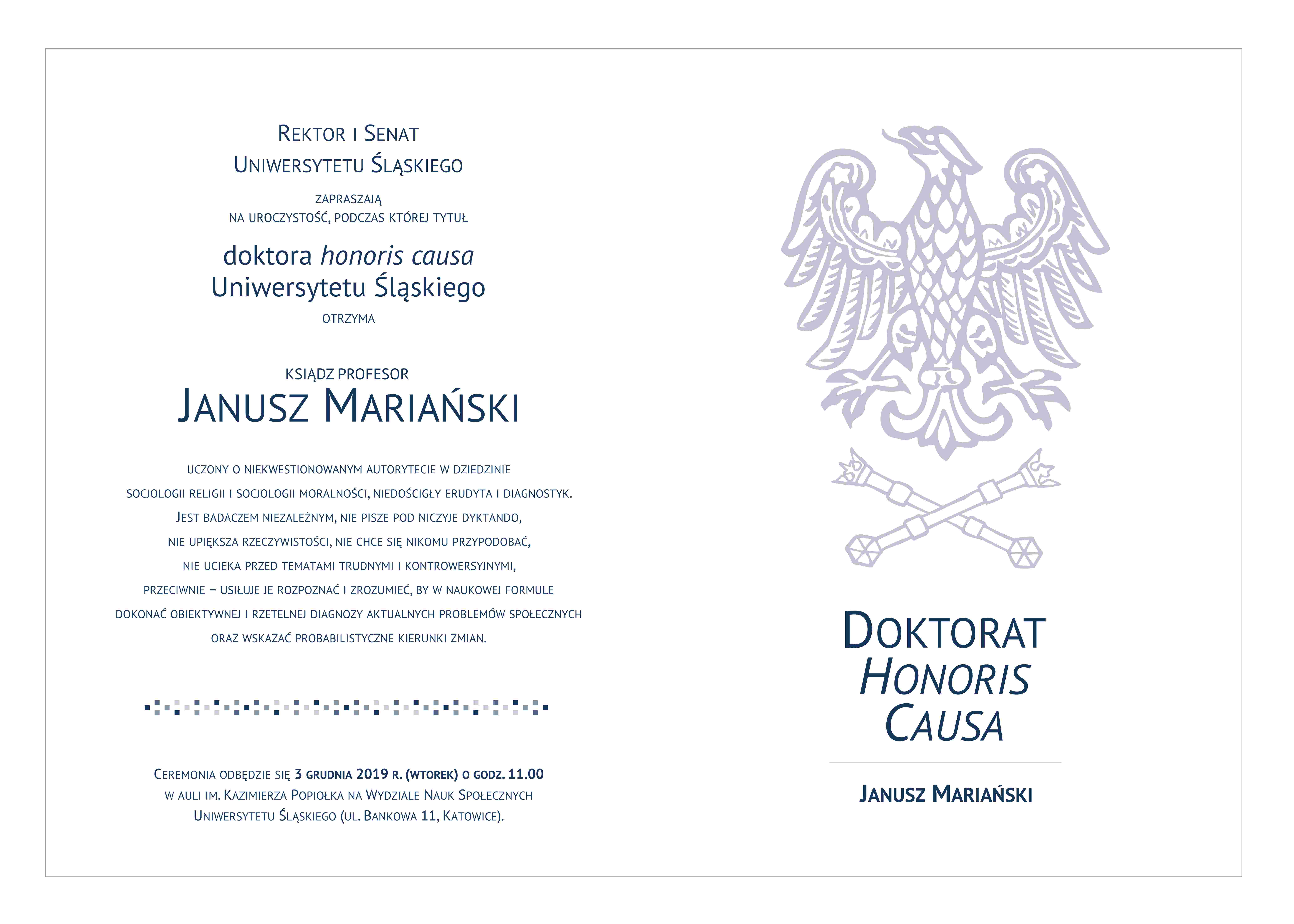 Ks. prof. dr hab. Janusz Mariański, autorytet w dziedzinie socjologii religii i socjologii moralności, niedościgły erudyta i diagnostyk, otrzyma tytuł doktora honoris causa Uniwersytetu Śląskiego w Katowicach. Uroczystość odbędzie się 3 grudnia 2019 roku o godz. 11.00 w auli im. Kazimierza Popiołka na Wydziale Nauk Społecznych (Katowice, ul. Bankowa 11). Tytuł został nadany na mocy uchwały Senatu Uniwersytetu Śląskiego z 24 września 2019 roku (uchwała nr 420).